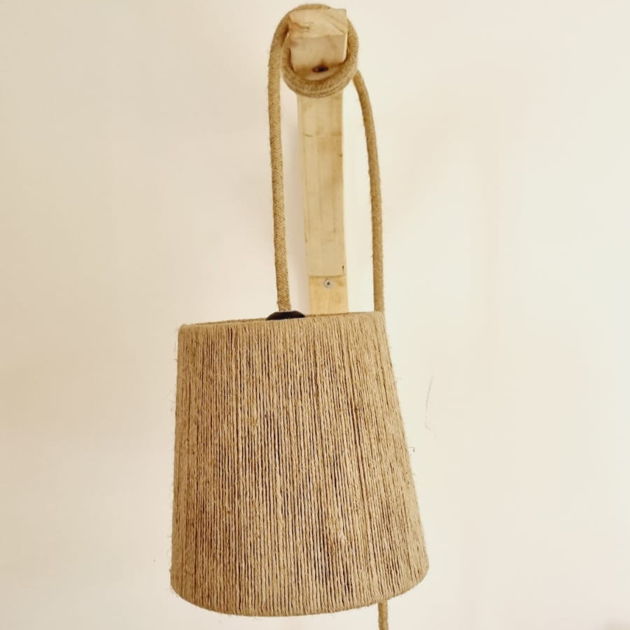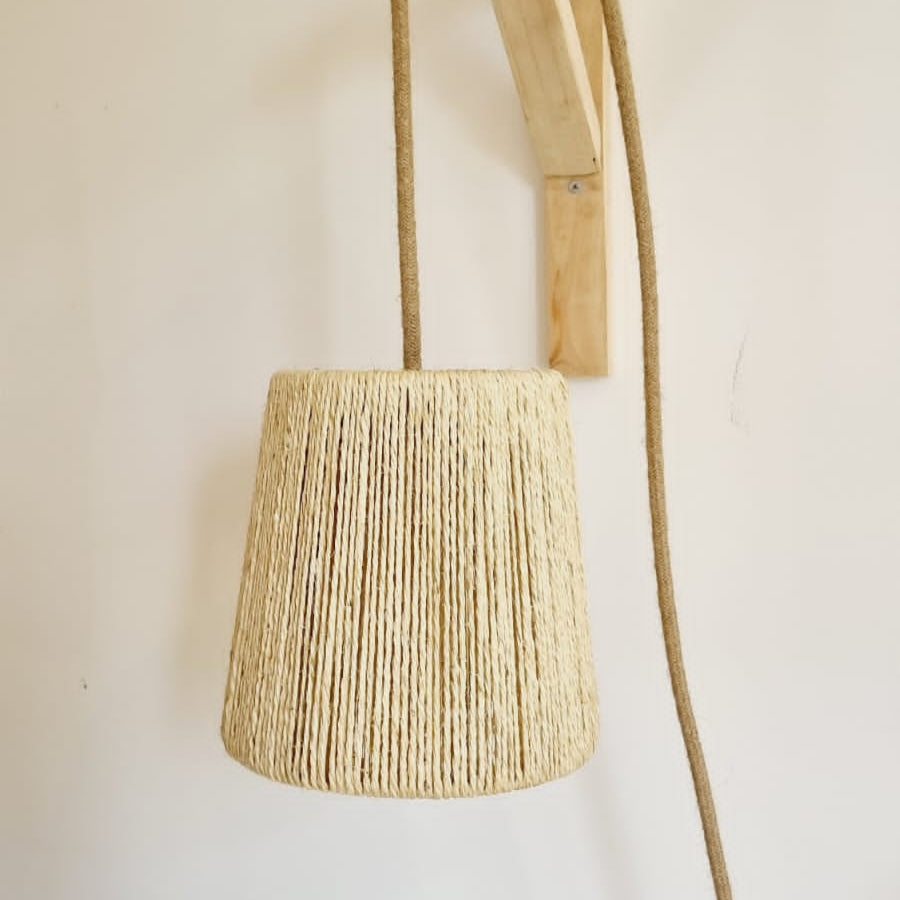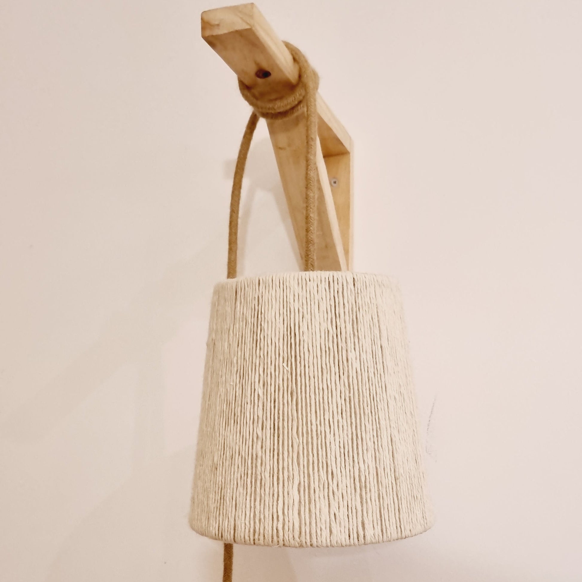 Lista para instalar, solo tienes que poner el soporte de la pared y enchufarla. Incluye soporte de madera, cable forrado en yute (con interruptor y enchufe) y ampolleta. Producto a pedido. Plazo máximo de despacho: 3 semanas