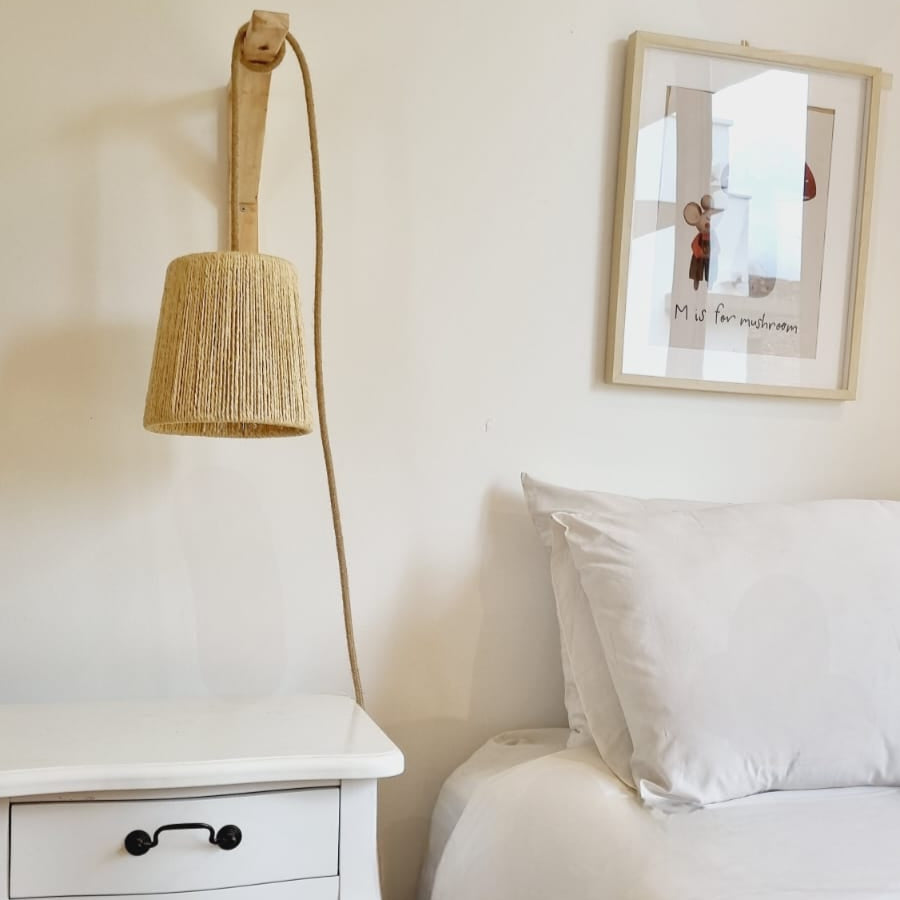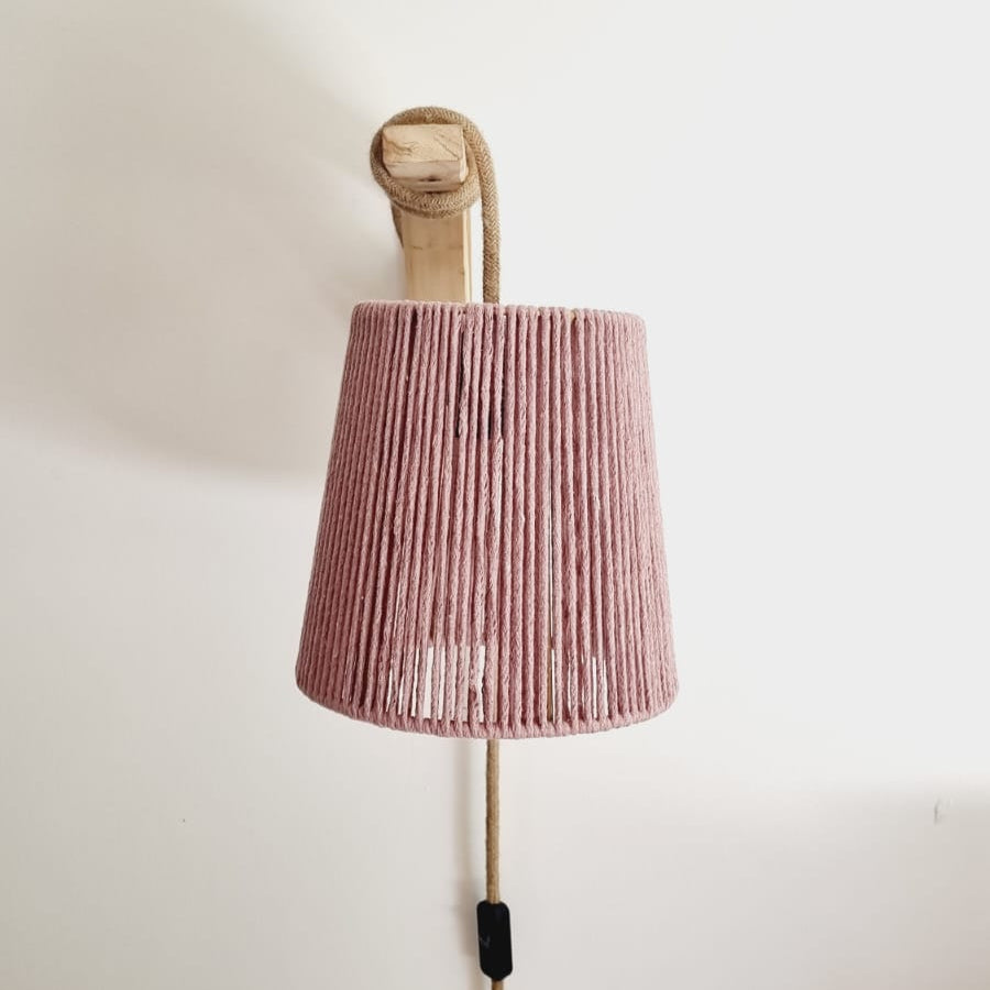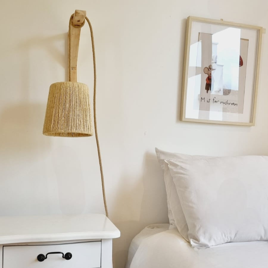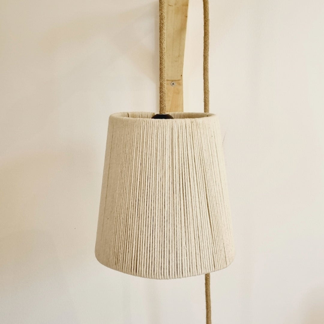 Lista para instalar, solo tienes que poner el soporte de la pared y enchufarla. Incluye soporte de madera, cable forrado en yute (con interruptor y enchufe) y ampolleta. Producto a pedido. Plazo máximo de despacho: 3 semanas
