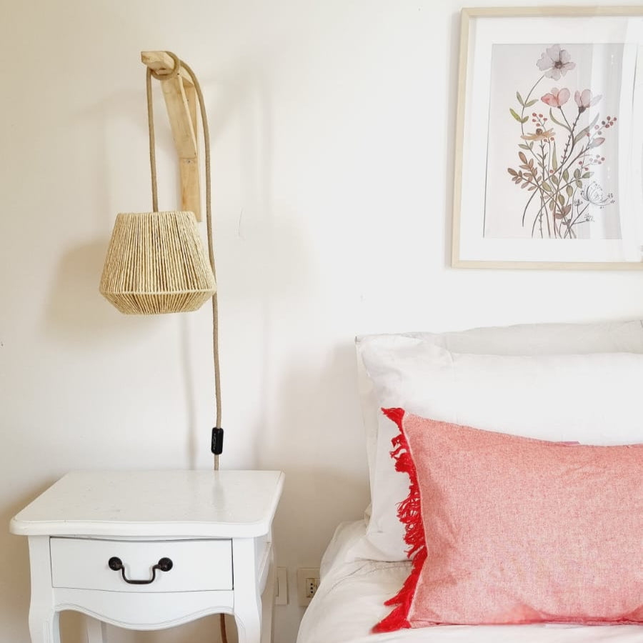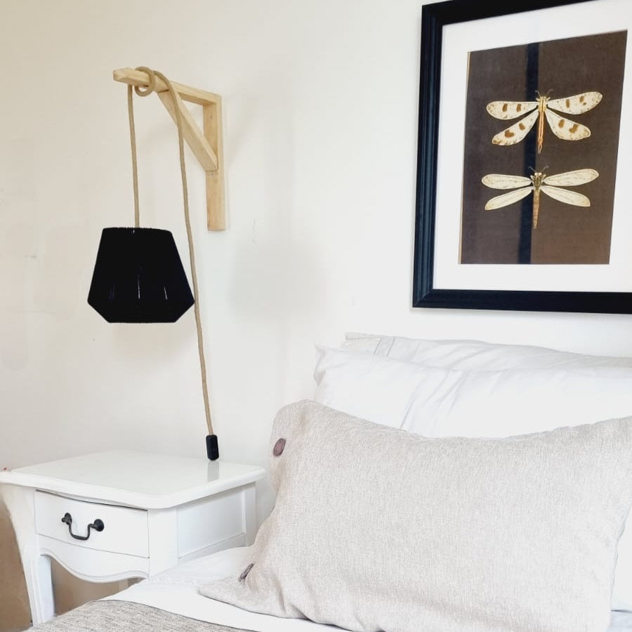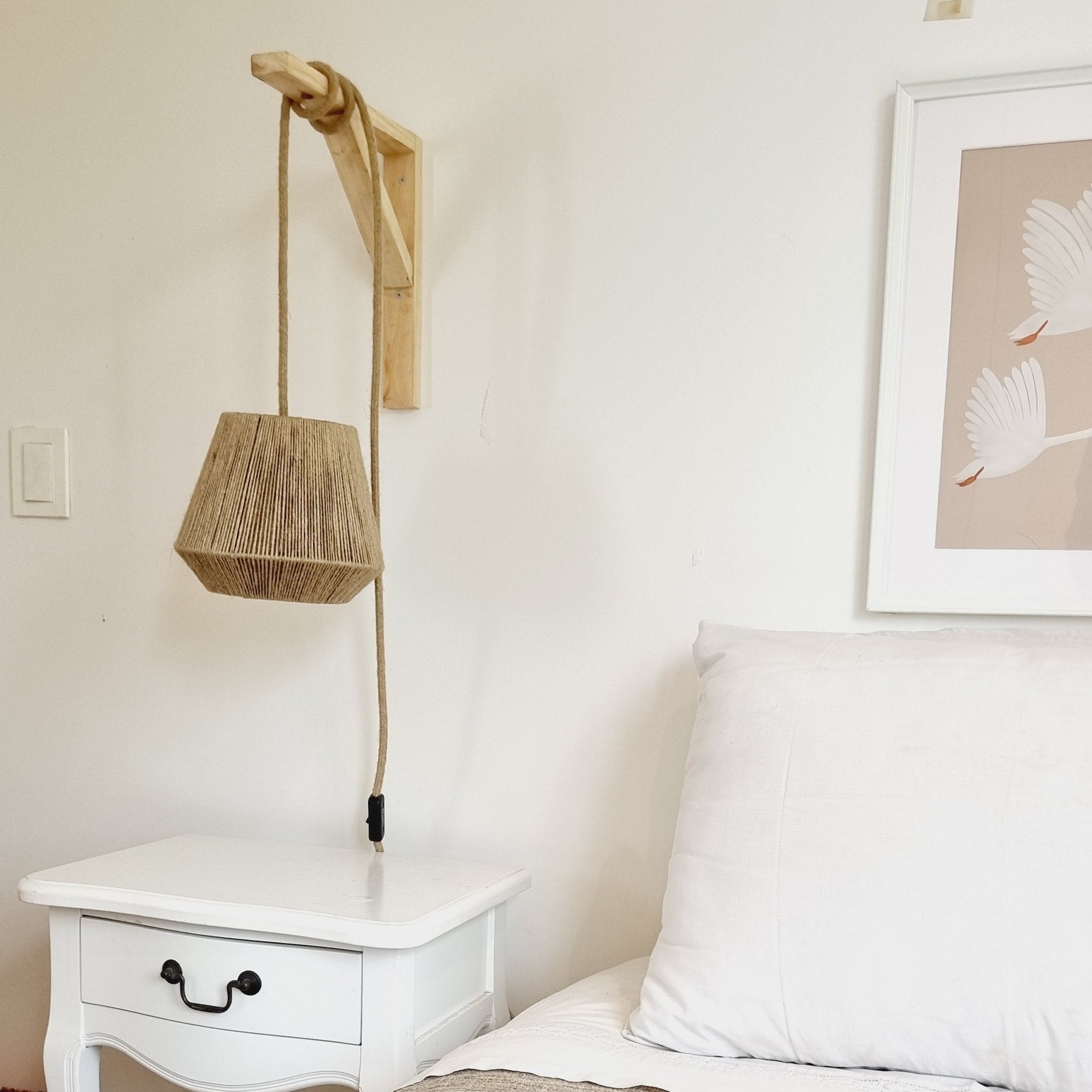 Lista para instalar, solo tienes que poner el soporte de la pared y enchufarla. Incluye soporte de madera, cable forrado en yute (con interruptor y enchufe) y ampolleta. Producto a pedido. Plazo máximo de despacho: 3 semanas