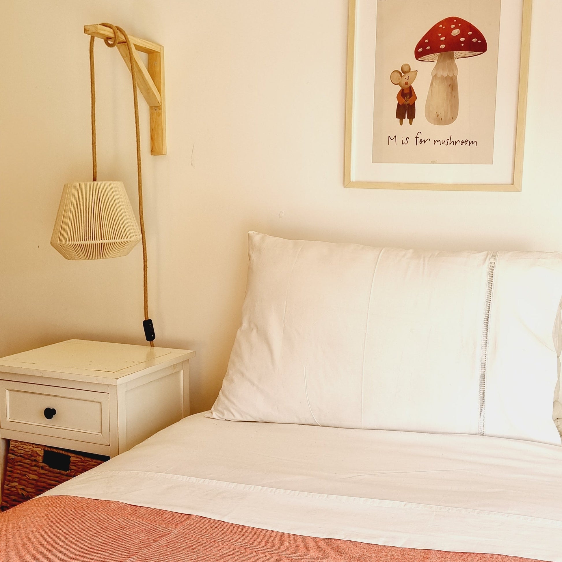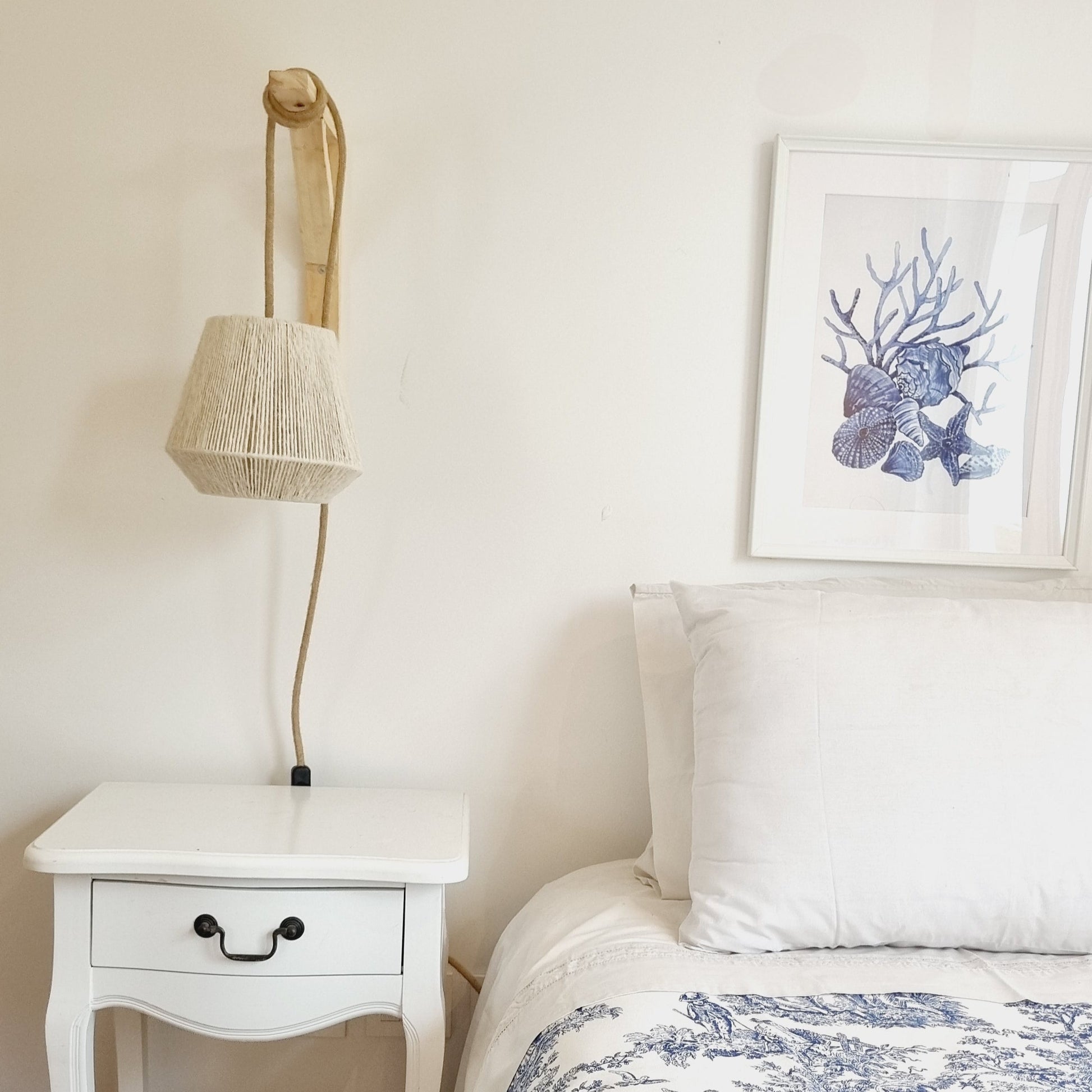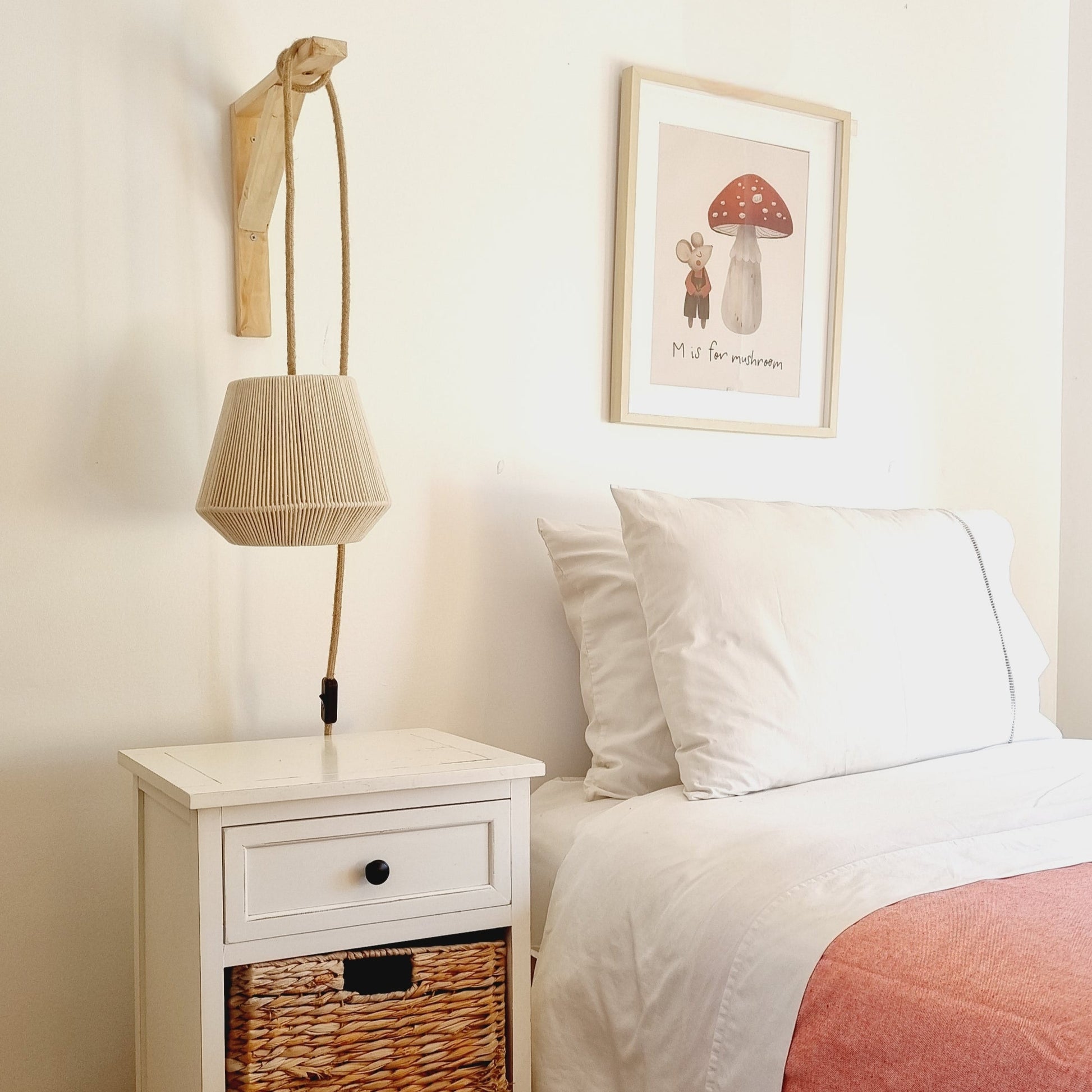 Lista para instalar, solo tienes que poner el soporte de la pared y enchufarla. Incluye soporte de madera, cable forrado en yute (con interruptor y enchufe) y ampolleta. Producto a pedido. Plazo máximo de despacho: 3 semanas