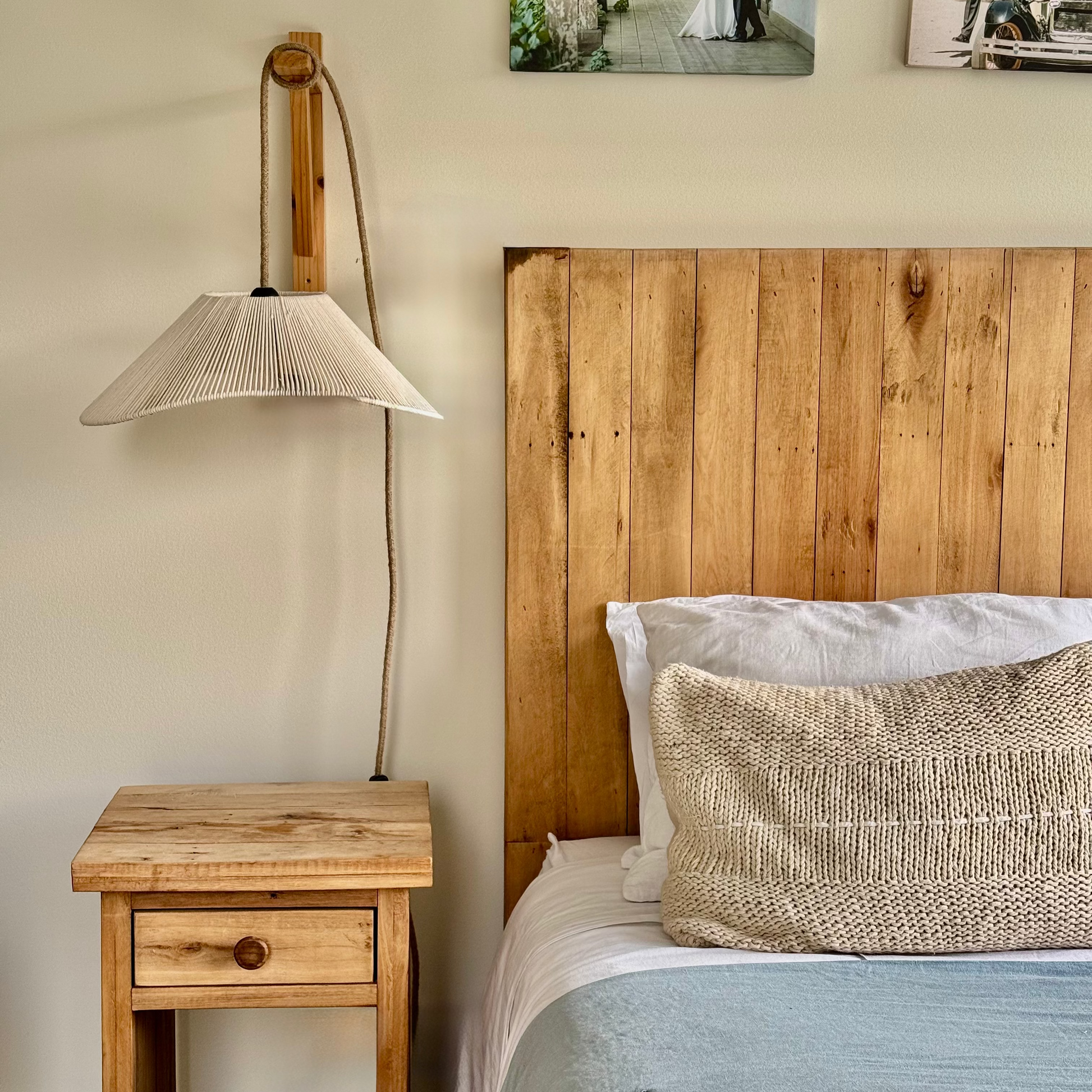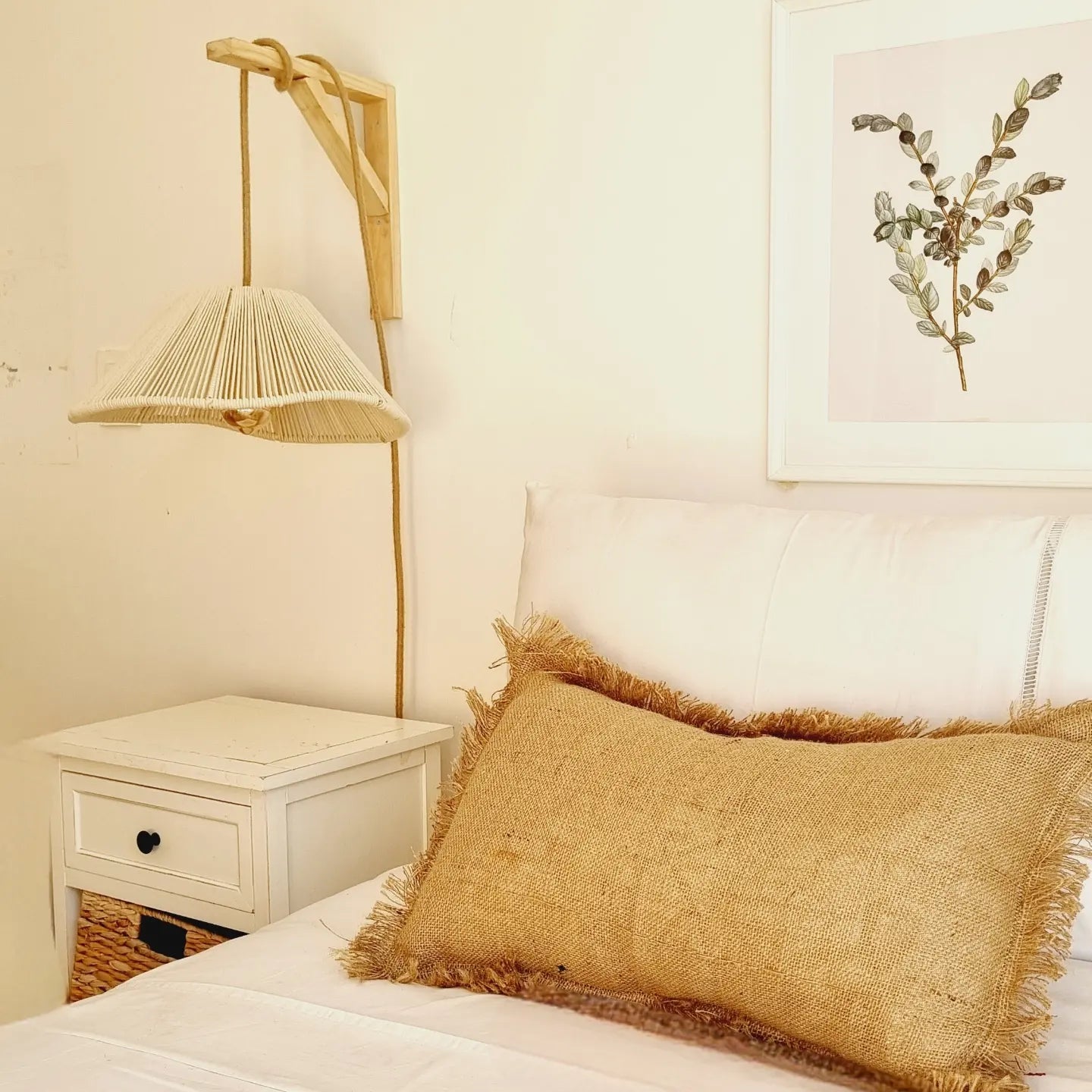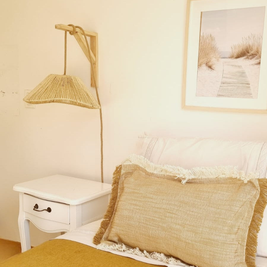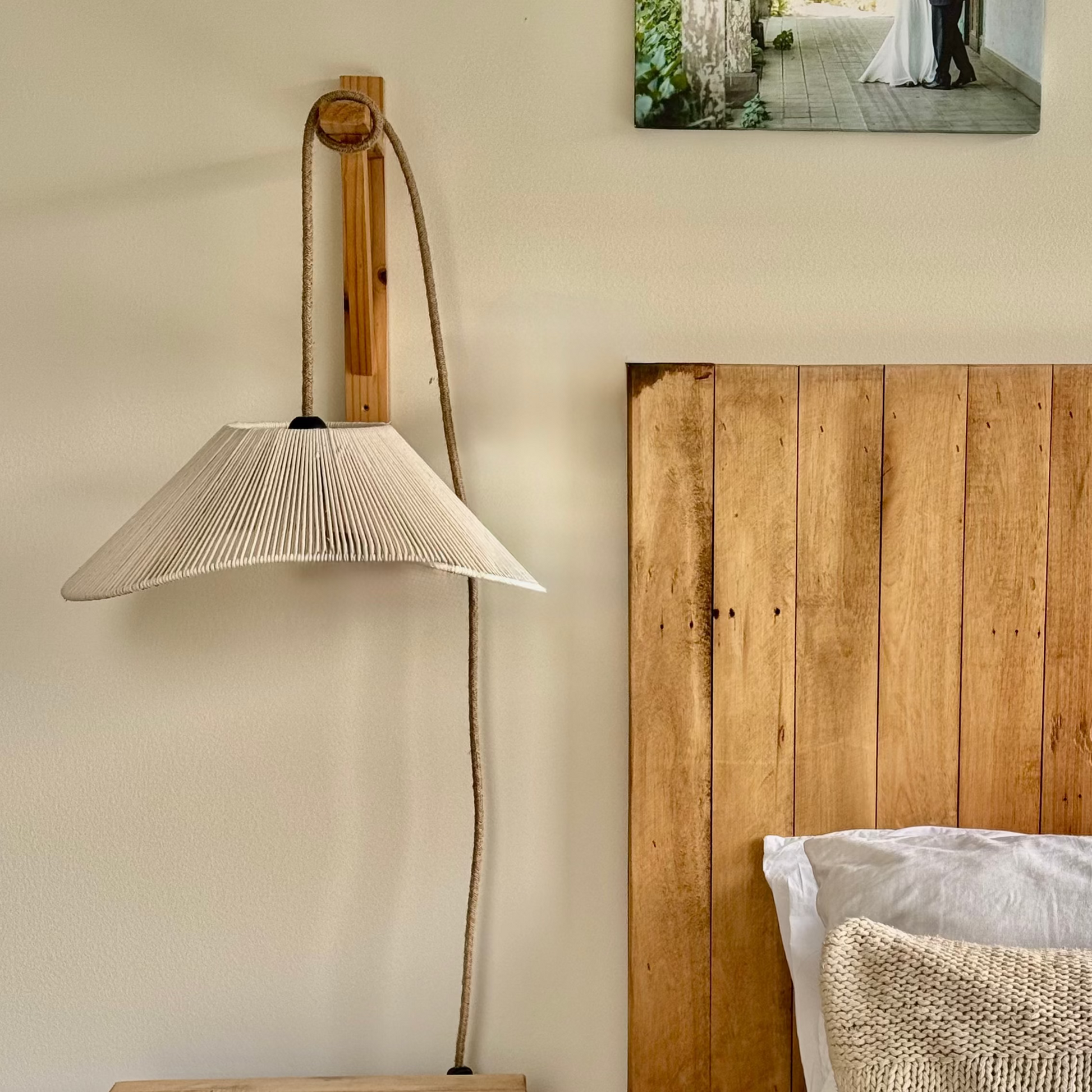 Lista para instalar, solo tienes que poner el soporte de la pared y enchufarla. Incluye soporte de madera, cable forrado en yute (con interruptor y enchufe) y ampolleta. Producto a pedido. Plazo máximo de despacho: 3 semanas