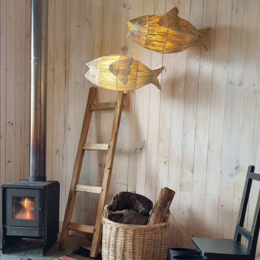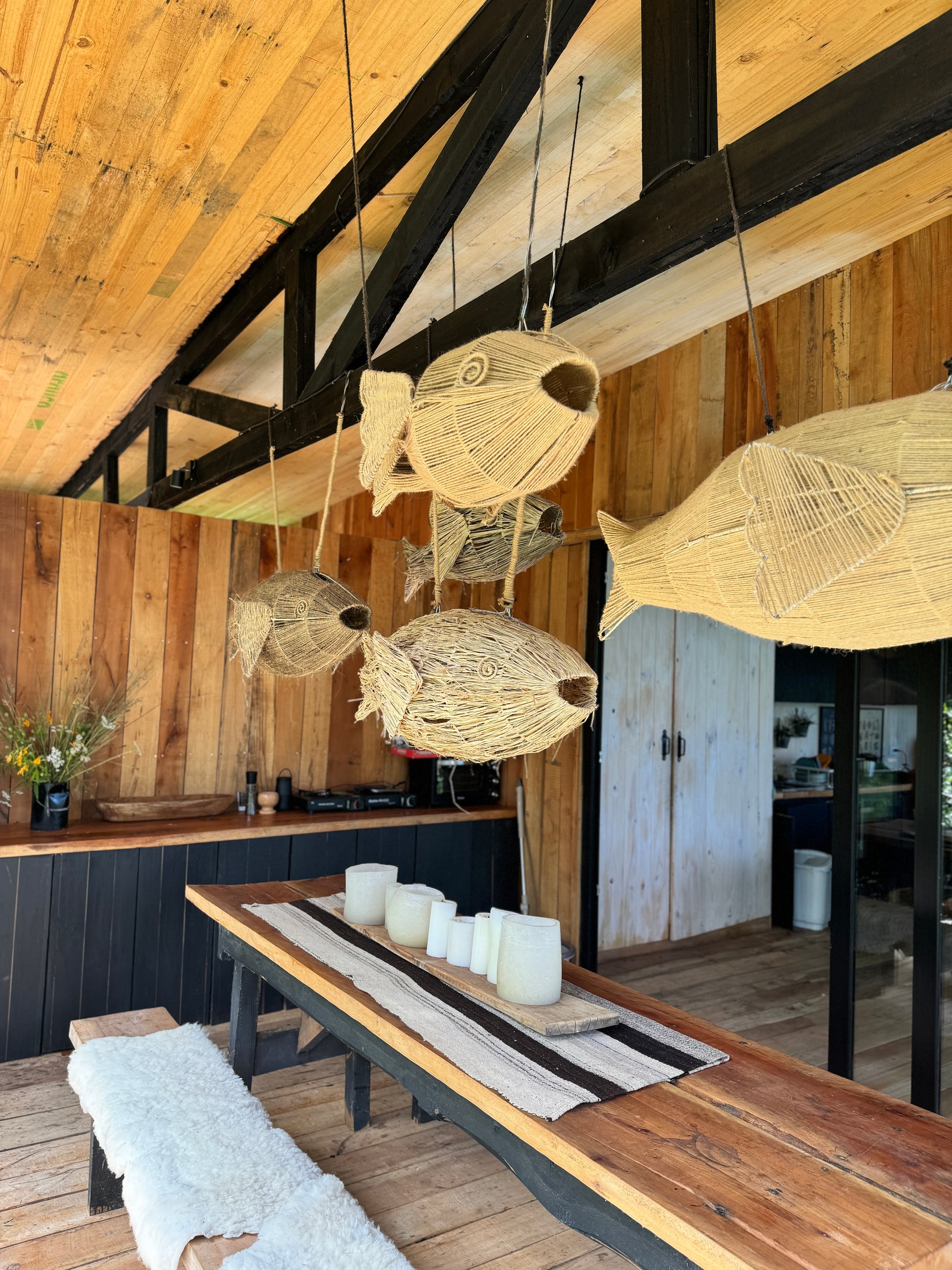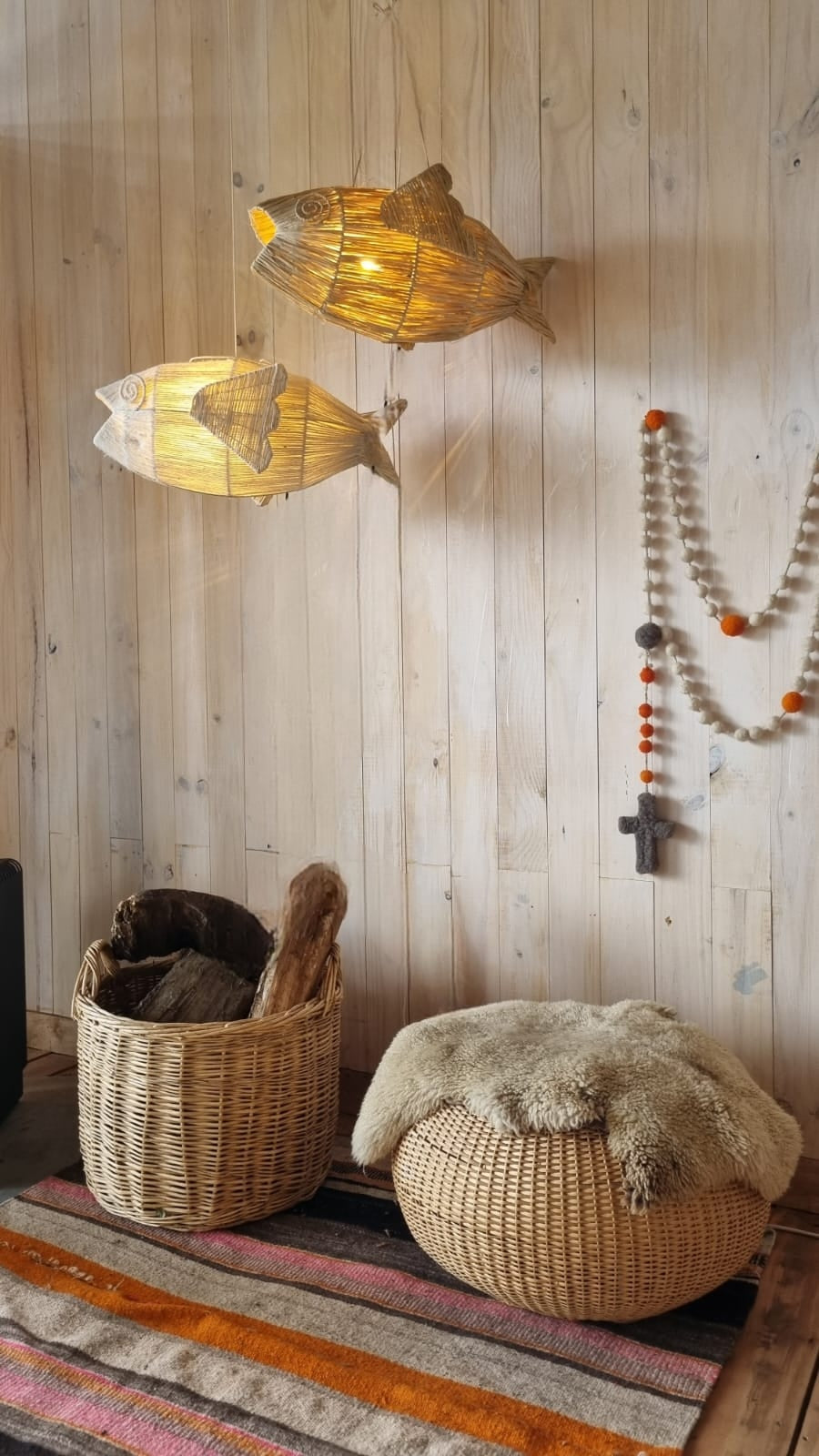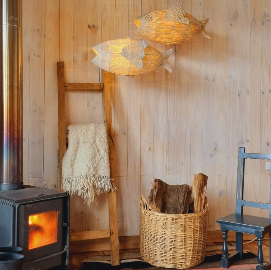 Incluye cable forrado en yute (1,5mts), ampolleta y baldaquín metálico para tapar conexión eléctrica en el techo.